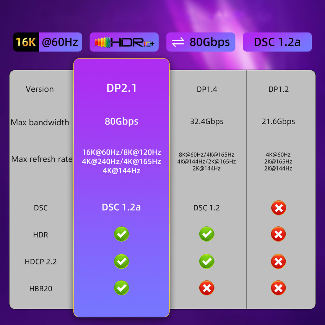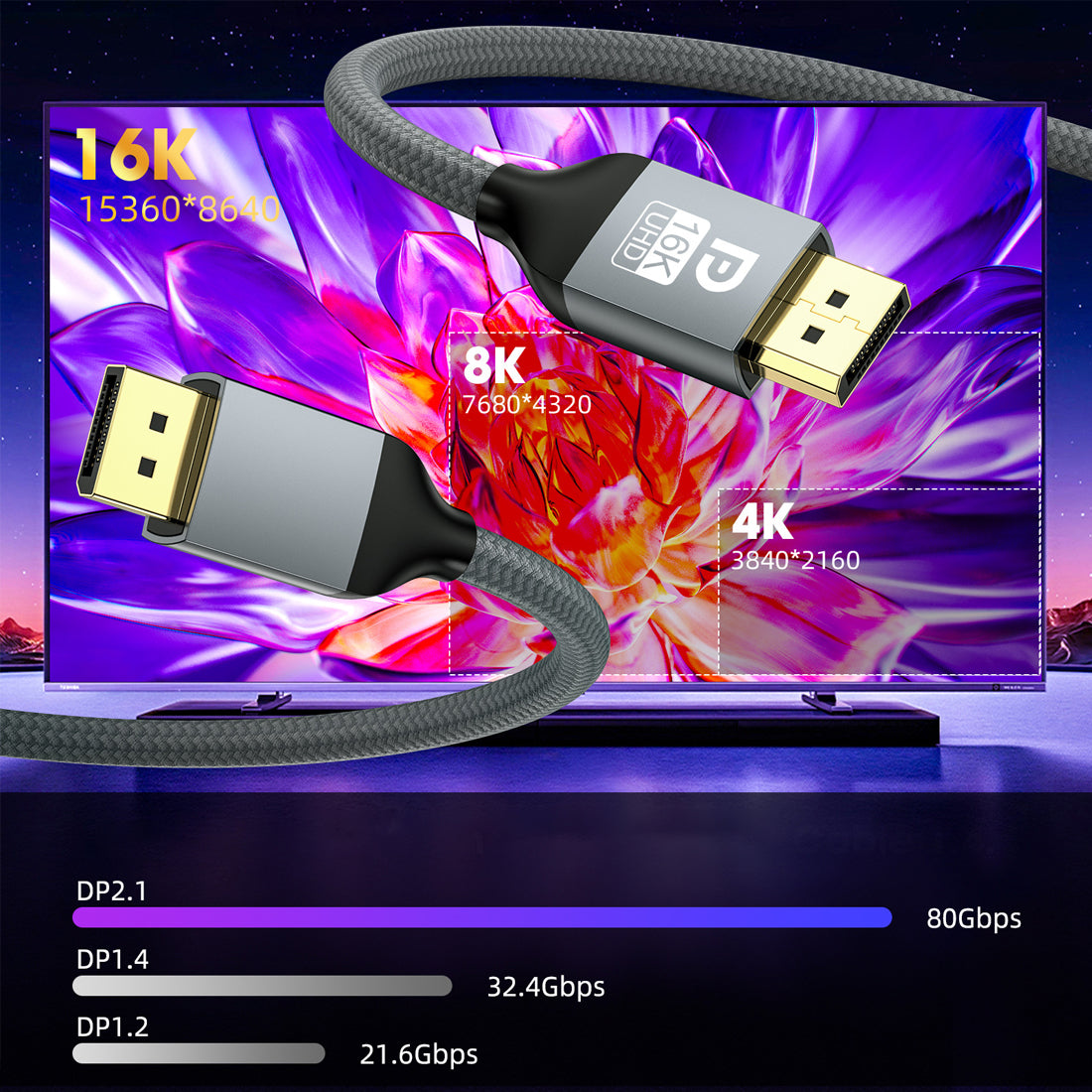 - DP 2.1 cable delivers ultra-high bandwidth of up to 80Gbps, supports high resolutions like 16K(15360*8640)@60Hz, backward compatible with 8K@120Hz, 4K@240Hz, and 2K@360Hz;